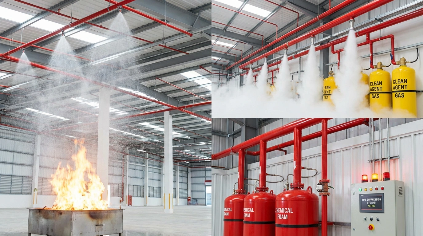 A Fire Suppression System automatically detects and stops fire using water, gas, or chemicals.