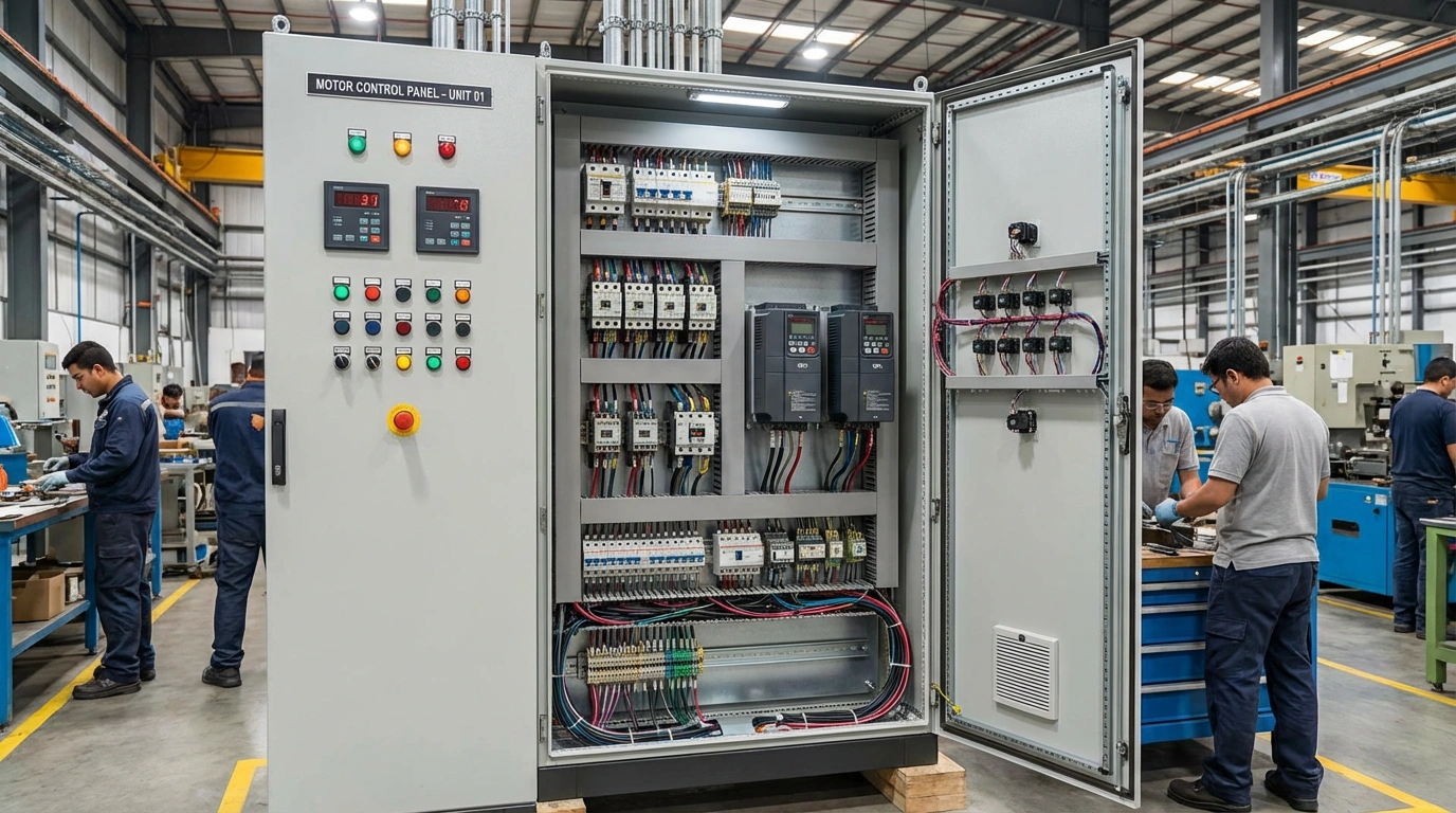 An electrical panel designed to control and protect motors, including functions like start/stop, speed control, overload protection, and monitoring.