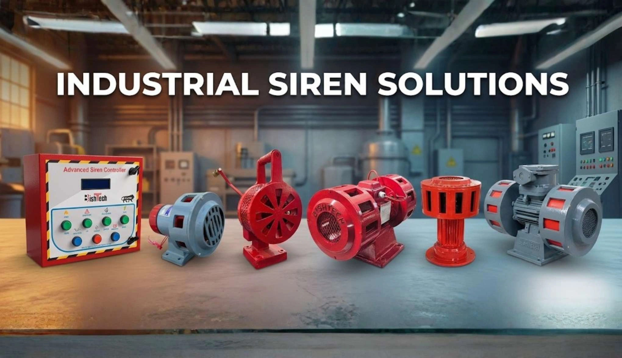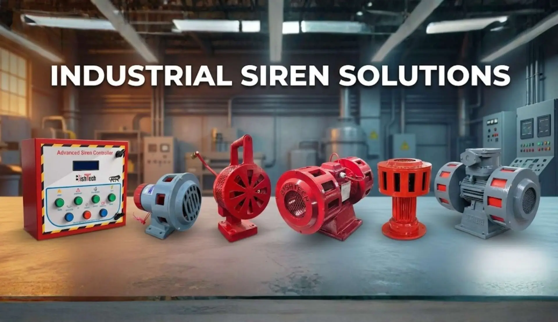 High-intensity warning sirens used in industries and factories to alert workers during emergencies such as fire, gas leak, or equipment failure.